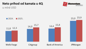 Prihodi iz investicionog bankarstva nastavili su odličan trend iz prethodnog dela 2025. godine, a analitičari očekuju nastavak trenda i u tekućoj godini usled blaže antimonopolske regulative, rekordnih nivoa na tržištu akcija i otporne američke privrede. Doprinos dobroj godini za banke dali su i prihodi od trgovanja hartijama od vrednosti, u velikoj meri usled povišenih fluktuacija na tržištu.