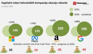Kapitalna ulaganja glavni fokus korporativnih objava – Objave kvartalnih rezultata američkih tehnoloških kompanija ostale su u senci njihovih planiranih kapitalnih izdataka koji su premašili ranije inače visoke prognoze. Protekle sedmice pred investitore su izašli Amazon koji je najavio kapitalna ulaganja u godini od 200 milijardi dolara, što je povećanje od 56 odsto i daleko više od konsenzusa tržišta, te Alphabet koji je za iste namene predvideo skoro duplo više nego lani, oko 180 milijardi dolara.