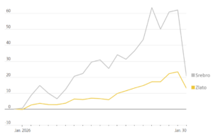 Promene vrednosti zlata i srebra u tekućoj godini (u %)