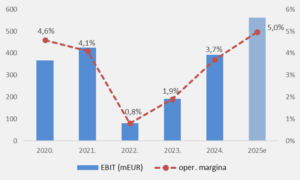 Kada je profitabilnost u pitanju, prilagođeni operativni profit je dostigao 96,3 miliona evra u odnosu na prošlogodišnjih 92,7 miliona evra, dok je prilagođena operativna margina pala sa 3,9 na 3,2 odsto. Bruto margina je oslabila na 39,6 odsto sa prošlogodišnjih 40,7 odsto, usled povećanih troškova marketinga u B2C segmentu i nižih margina preuzete platforme, što je delimično neutralisano efikasnošću B2B segmenta. Kompanija i dalje cilja srednjoročnu bruto marginu od oko 40 odsto.