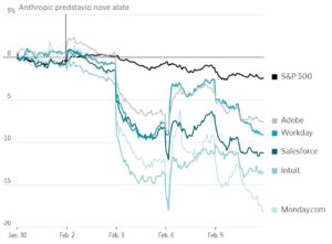 Već mesecima analitičari prognoziraju kakav će uticaj Anthropic i drugi sofisticirani alati veštačke inteligencije (AI) naneti kompanijama koje se bave softverom kao uslugom, a koje su bile neprikosnoveni lideri tržišta u Internet eri. Alati koje su napravile kompanije kao što su Workday, Monday.com i Adobe postali su digitalna okosnica većeg dela korporativnog sveta.