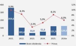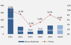 Kada je u pitanju raspodela ostvarene dobiti, uprava kompanije je predložila isplatu dividende u bruto iznosu od 124,63 dinara (prinos 6,0 odsto), što je neznatno više u odnosu na prošlogodišnjih 121,45 dinara po akciji. Akcionarima će biti ukupno isplaćeno 1,9 milijardi dinara, što mahom čini polovina dobiti iz segmenta neživotnih osiguranja i manji deo dobiti iz segmenta životnog osiguranja.