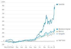 Akcije u sektoru su glavne zvezde Volstrita u proteklih godinu dana. Micron, Seagate i Western Digital su više nego duplirali vrednost prošle godine, a u tekućoj godini su takođe najveći dobitnici. Proizvođač fleš memorije Sandisk je skočio 10 puta otkada se odvojio od kompanije Western Digital u februaru prošle godine. Južnokorejski SK Hynix, koji je takođe specijalizovan za memorijske čipove, skočio je 88 odsto u poslednja tri meseca.