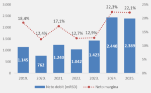 Delimično usled većeg rasta prihoda od kamata, konsolidovana neto dobit kompanije pala je samo 2,1 odsto na 2,4 milijarde dinara.